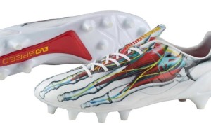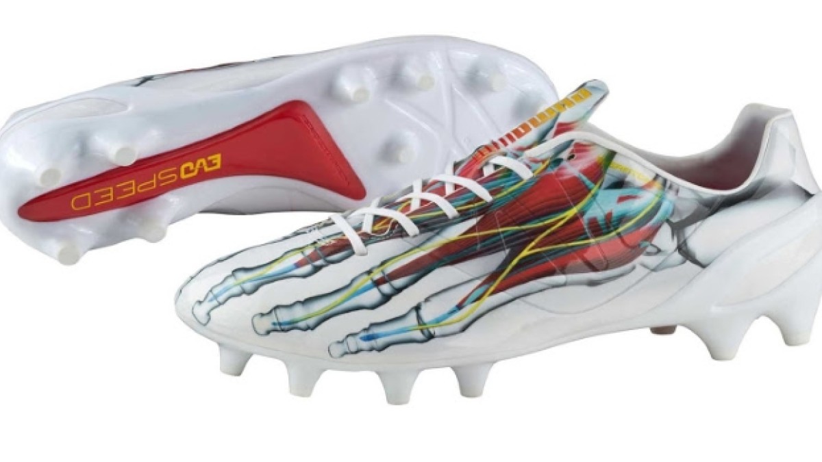 Se trata de una edición limitada de los botines Evospeed 1.3 de Puma, con un diseño que emula los huesos del pie humano. El botín es predominantemente blanco, con detalles en rojo, azul y amarillo.