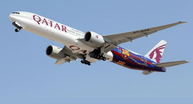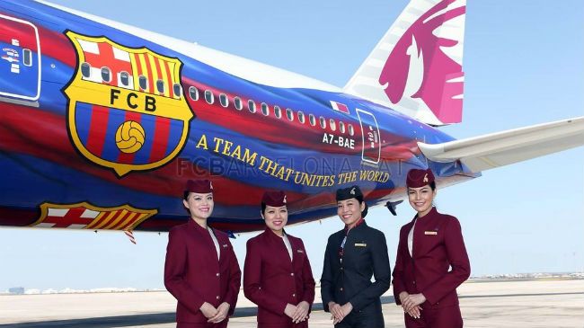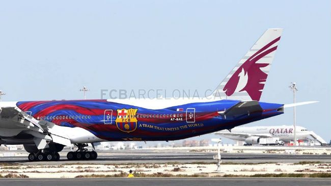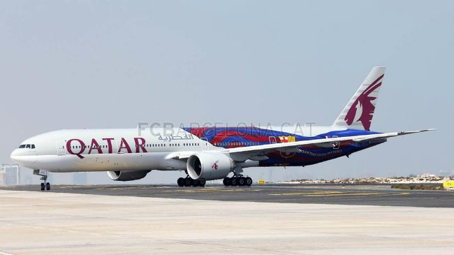 Qatar Airways y el FC Barcelona llevan su asociación hasta el cielo con la introducción de los colores del FC Barcelona en un Boeing 777 por primera vez. El aparato ha llegado de Bangkok esta semana al aeropuerto internacional de Doha. Trabajando en el concepto de "un equipo que une el mundo", que se introdujo por primera vez en el spot de TV creado para apoyar la asociación entre ambas entidades, el diseño incorpora la bandera coloreada del Barça adornando el fuselaje de un Boeing 777.