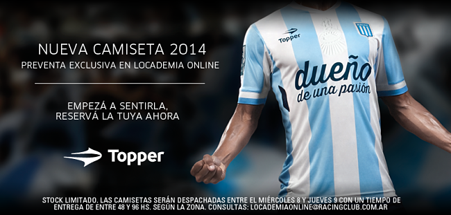 Topper firmó un contrato con Racing, por los próximos 3 años. Los hinchas académicos tienen un gran recuerdo de esta marca, dado que en su último título la camiseta también era Topper. Asi mismo, el 2014 también es especial para los sponsors y Racing, dado que Banco Hipotecario se transformará en el auspiciante con más años en la camiseta de Racing, cumpliendo 5 años en la misma.