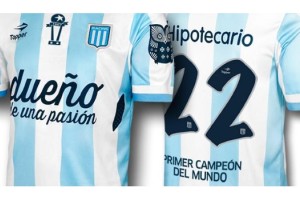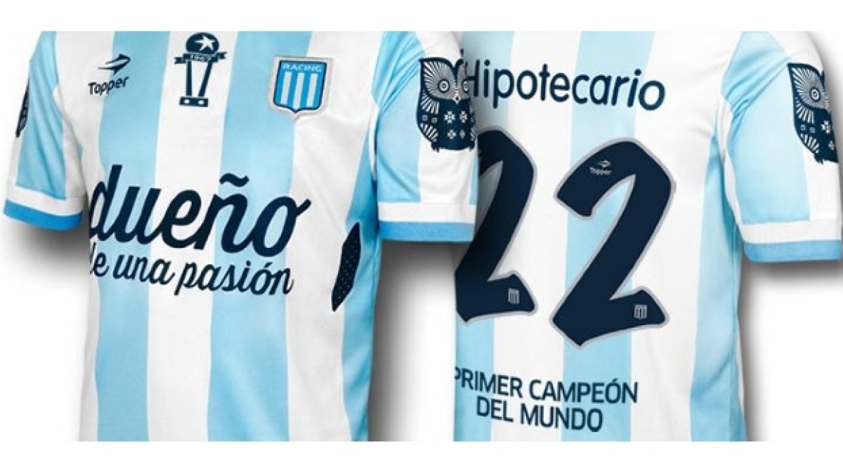 En el pecho de la camiseta de Racing, entre el logo de Topper y el escudo del club estará presente este emblema con la figura de la Copa Intercontinental. Mientras que en la espalda, debajo del número de los jugadores, aparecerá la frase “PRIMER CAMPEÓN DEL MUNDO”.