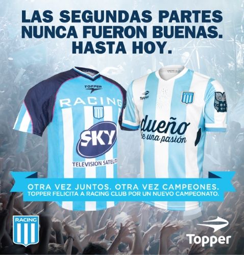 Topper tiene el detalle histórico de haber salido campeón con Racing en sus últimos dos títulos. En aquel Apertura 2001, tras 35 años de sequía, y en este Torneo de Transición 2014. “Las segundas partes nunca fueron buenas. Hasta hoy. Otra vez juntos, otra vez campeones” festejó la marca.