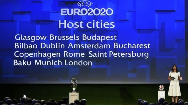 19 ciudades presentaron su candidatura para tener algunos de los partidos de la competición en sus estadios. Las ganadoras fueron: Londres (Inglaterra), Copenhague (Dinamarca), Bucarest (Rumanía), Amsterdam (Holanda), Dublín (República de Irlanda), Budapest (Hungría), Bruselas (Bélgica), Glasgow (Escocia), Múnich (Alemania), Baku (Azerbaiyán), Roma (Italia) y San Petersburgo (Rusia).