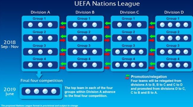 Las 54 selecciones UEFA estarán repartidas en cuatro divisiones: Liga A, B, C y D. Las dos primeras tendrán cuatro grupos de tres equipos, la tercera división dos grupos de tres y dos de cuatro y la última cuatro grupos de cuatro equipos. Las divisiones se conformarán de acuerdo al ranking de las selecciones.