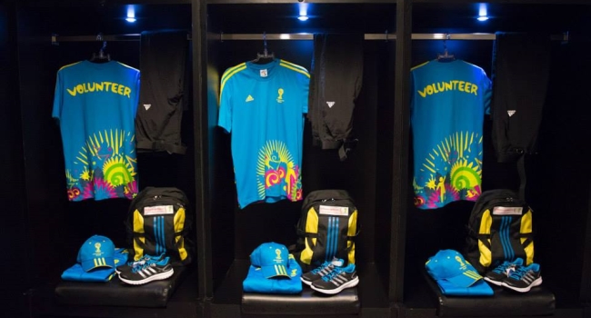 Adidas presentó en Río de Janeiro la línea completa de uniforme y accesorios que los más de 1.500 voluntarios de Brasil 2014 vestirán durante el mes que dure la competencia. Una remera manga corta, una campera, un pantalón, una gorra, un par de zapatillas y una mochila componen el kit que recibirán estos chicos y chicas de 130 países.