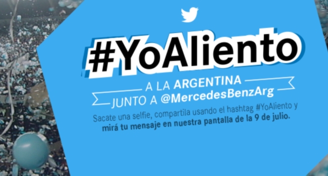 A través del hashtag #YoAliento, Mercedes Benz Argentina invita a los hinchas de la Albiceleste a compartir sus selfies a la cuenta de Twitter de la empresa y las mismas aparecerán en la pantalla gigante que tiene la compañía en la Avenida 9 de Julio.
