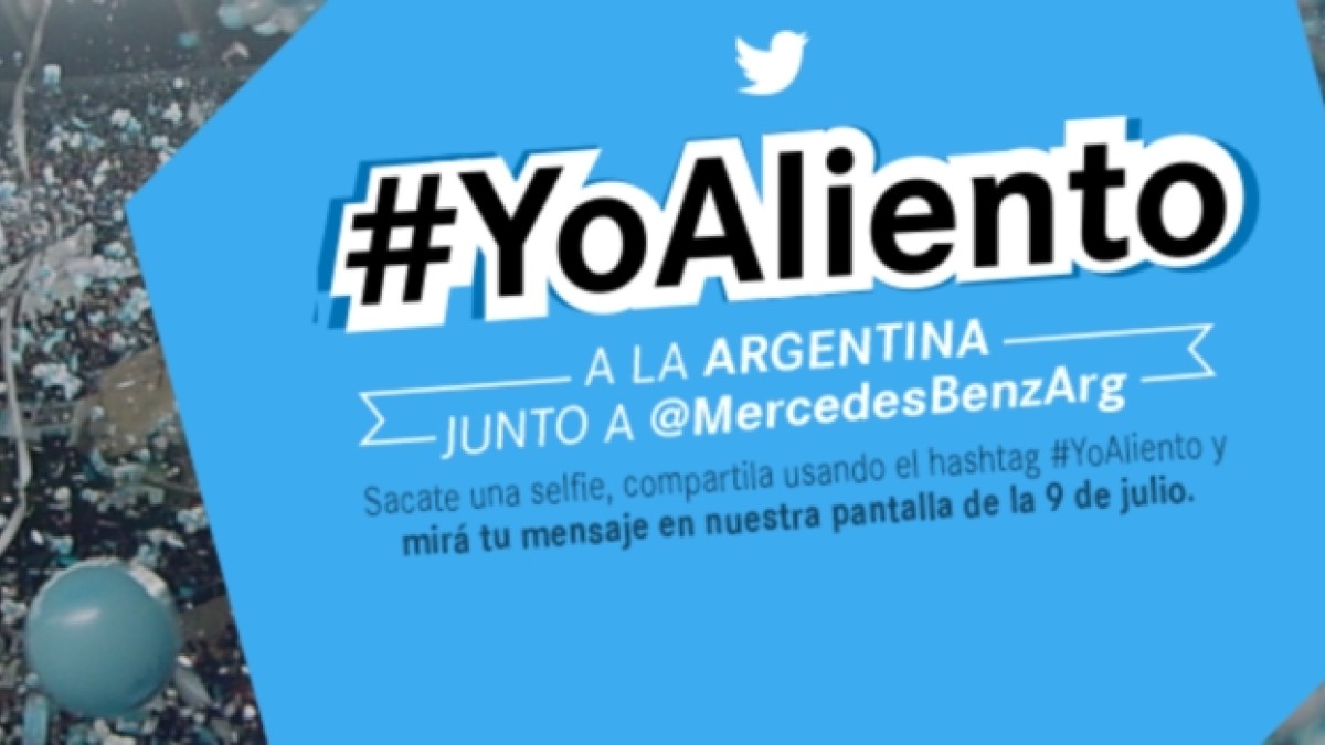 A través del hashtag #YoAliento, Mercedes Benz Argentina invita a los hinchas de la Albiceleste a compartir sus selfies a la cuenta de Twitter de la empresa y las mismas aparecerán en la pantalla gigante que tiene la compañía en la Avenida 9 de Julio.