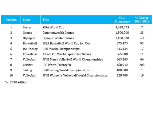 El Mundial de Básquet, el Mundial de Hockey sobre hielo, los Juegos Ecuestres, el Mundial de Vóley masculino, el ICC World Twenty20 de Cricket, el Mundial de Vela y el Mundial de Vóley femenino completan el top 10.