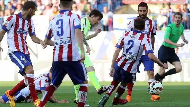 En 2014, el Atlético de Madrid ganó La Liga tras empatar en el Camp Nou en la última jornada. Un año después, el Barça fue quien se aseguró el título en el campo de los colchoneros (0-). Leo Messi se las ingenió para hacer el gol de la victoria pese a estar rodeado de defensas. Era la séptima liga para el argentino.