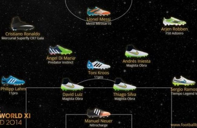 El arquero Manuel Neuer, el defensor Philip Lahm, los volantes Toni Kroos y Ángel Di María y los delanteros Arjen Robben y Lionel Messi usan botines de la marca alemana.