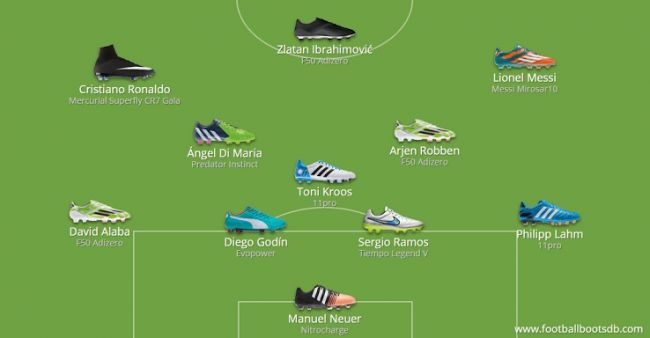 Manuel Neuer (Nitrocharge), Philip Lahm (11pro), David Alaba (F50 adizero), Toni Kross (11pro), Arjen Robben (F50 adizero), Ángel Di María (Predator Instinct) y Lionel Messi (Mirosar10) son los embajadores adidas presentes. Sergio Ramos (Tiempo Legend V) y Cristiano Ronaldo (Mercurial Superfly CR7 Gala) pertenecen a Nike mientras que Diego Godín (Evopower) es el embajador Puma.