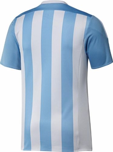 La prenda titular presenta las tradicional tiras verticales, tres celeste y cuatro blancas, con los hombros y las mangas completamente celestes. El detalle saliente de este modelo son las tres tiras y el cuello en blancos. El logotipo de adidas también es blanco y el emblema de la AFA con borde celeste completan el diseño.