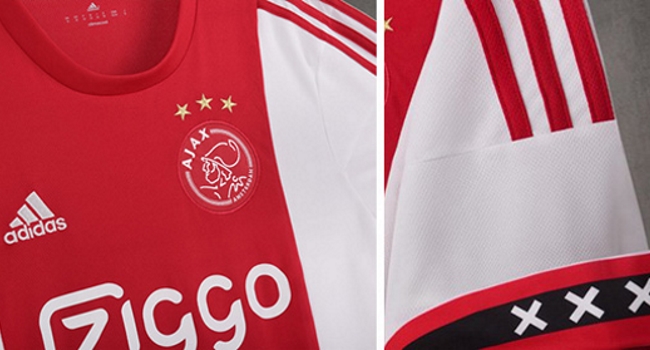 La primera indumentaria respeta el diseño histórico del club holandés, combinando rojo y blanco. Las tres tiras sobre los hombros son rojas y aparecen en los puños de las mangas tres “X” que aluden a la bandera de Amsterdam.