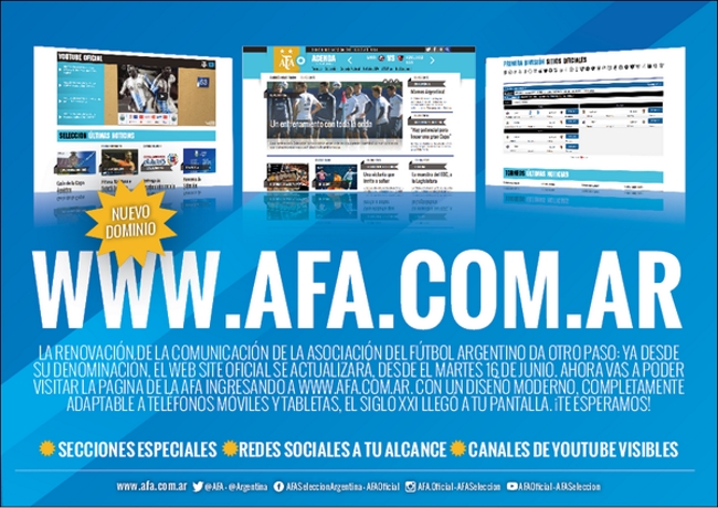 “La renovación de la comunicación de la Asociación del Fútbol Argentino da otro paso: ya desde su denominación, el web site se actualizará y ahora vas a poder visitar la página de la AFA ingresando a www.afa.com.ar, con un diseño moderno, completamente adaptable a teléfonos móviles y tabletas. El Siglo XXI llegó a tu pantalla. ¡Te esperamos!” informaron.