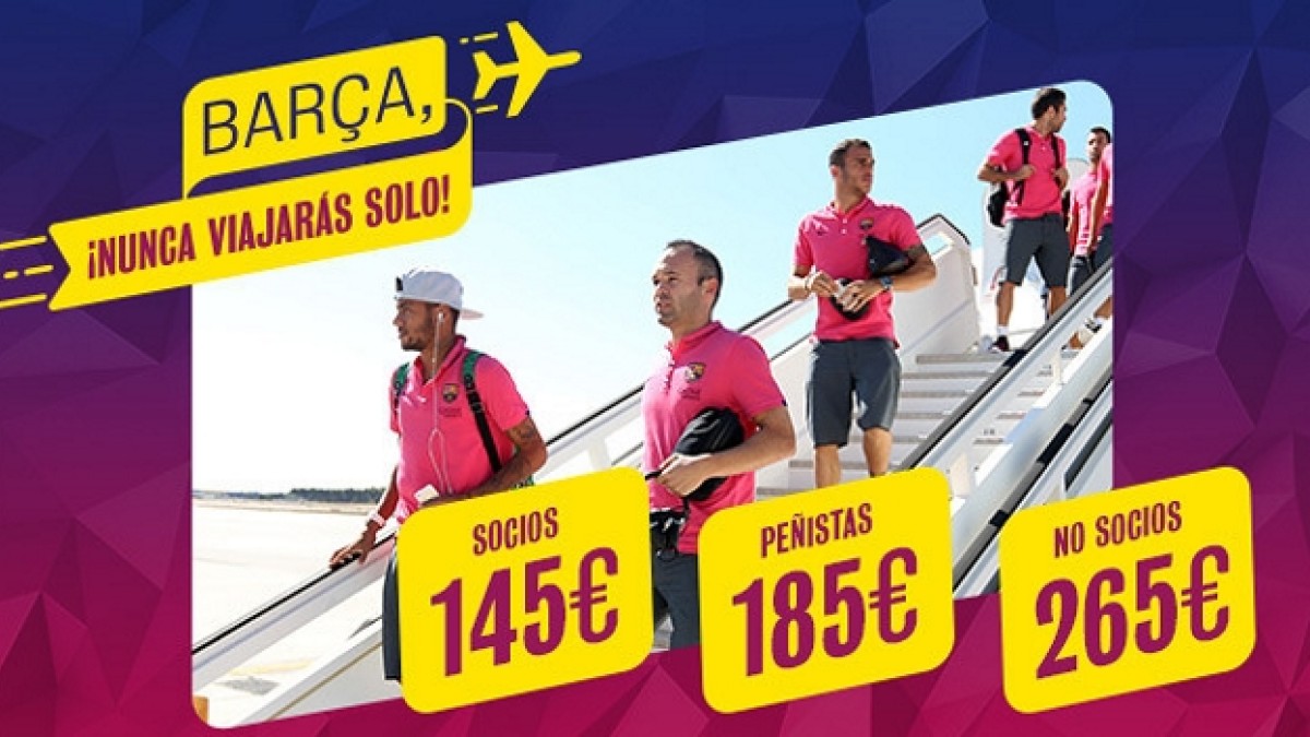 ¡Nunca viajarás solo! es el lema con el que Barcelona presentó su programa “Desplazamientos” a través del cual invita a los fanáticos a comprar un paquete para viajar a los partidos por Liga, Copa del Rey o Champions League junto al equipo principal.