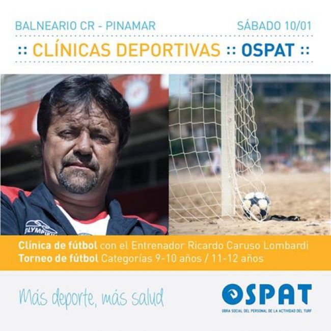 Este sábado 10 de enero comienza el ciclo de clínicas deportivas OSPAT en el Balneario CR de Pinamar, con la participación del director técnico Caruso Lombardi. Además de la clínica de fútbol, prevista para las 14.30 hs, desde las 11hs se disputará el torneo de fútbol infantil "Copa OSPAT", en las categorías 9-10 años y 11-12 años.