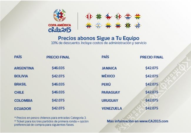 Este miércoles inició una nueva etapa de la venta de entradas para la Copa América de Chile 2015, con los abonos "Sigue a tu equipo", que incluyen los boletos para los tres partidos de Primera Fase de cada una de las selecciones. Además, comprar este paquete asegura un cupo de entradas para las etapas definitorias del certamen.