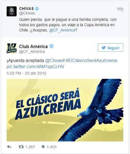 Se hizo habitual en el último tiempo que las cuentas de Twitter de clubes interactúen entre sí previo a enfrentarse en el campo de juego. Antes del Clásico de la Liga Mx, fueron @Chivas y @CF_América quienes se intercambiaron mensajes con algunas bromas.