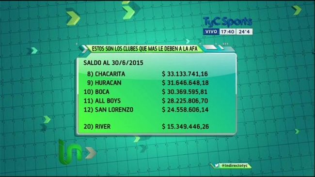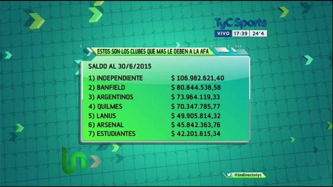 Mientras Independiente se ubicó como el club que más debe a la AFA, con $106.982.621,40. River Plate ocupa el lugar opuesto del listado, en el puesto 20°, con una deuda de $15.349.446,26.