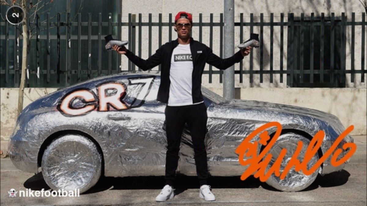CR7 filmó cómo tapaba todo el auto de Quaresma con papel metalizado y luego, con aerosol, estampaba sus iniciales en uno de los costados del vehículo. Todo esto, imitando el diseño de sus nuevos botines Nike Mercurial Superfly Silverware.