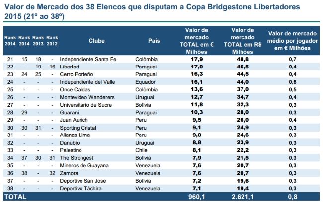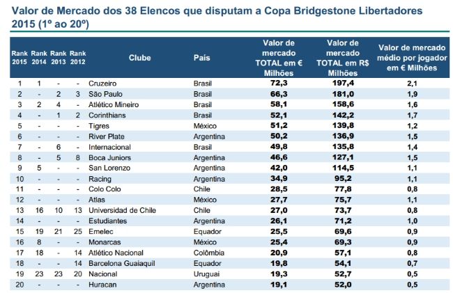 La consultora brasilera Pluri elaboró un nuevo ranking, esta vez orientado al valor de mercado de cada uno de los 38 equipos que participan en la Copa Bridgestone Libertadores 2015, entre la fase previa y los ya clasificados a la fase de grupos.