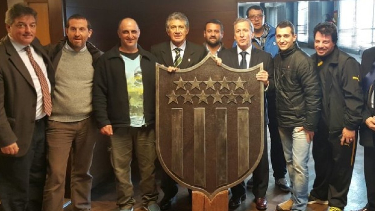 La directiva de Peñarol recibió un escudo de hierro para el estadio aurinegro