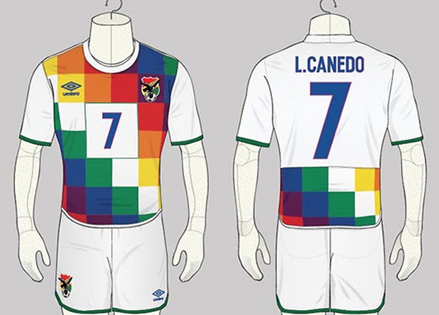 Un diseñador inglés llamado Angelo Troffa decidió crear un modelo de la camiseta de la Selección de Bolivia, tras un viaje que realizó por el país, donde eligió reflejar la Bandera Whipala (representa a los pueblos indígenas de Bolivia, casi un 60% de la población).