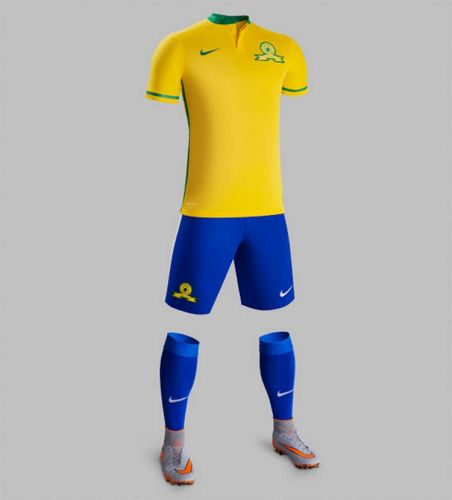 Se trata de los Mamelodi Sundowns, equipo que viste Nike en la primera división sudafricana. La camiseta combina el amarillo con detalles verdes en cuello y mangas, acompañado por pantalones y medias azules.