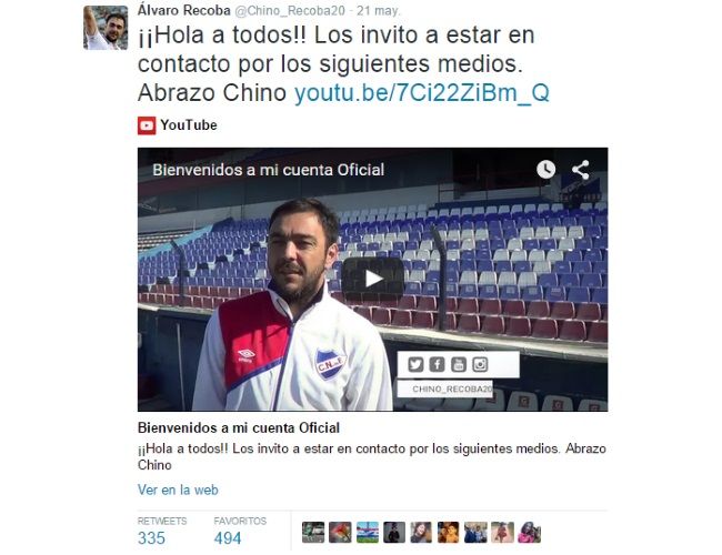(@Chino_Recoba20) y las repercusiones no se hicieron esperar, posicionando al ex futbolista como una fuente de información in house para medios y deportistas, tal como sucedió en las últimas horas, cuando Recoba anunció en sus cuentas oficiales (Twitter, Facebook e Instagram) que en febrero del 2016 tendría su partido despedida en Montevideo, siendo ésta una noticia no sólo de las más leídas en medios uruguayos, sino también en los extranjeros.
