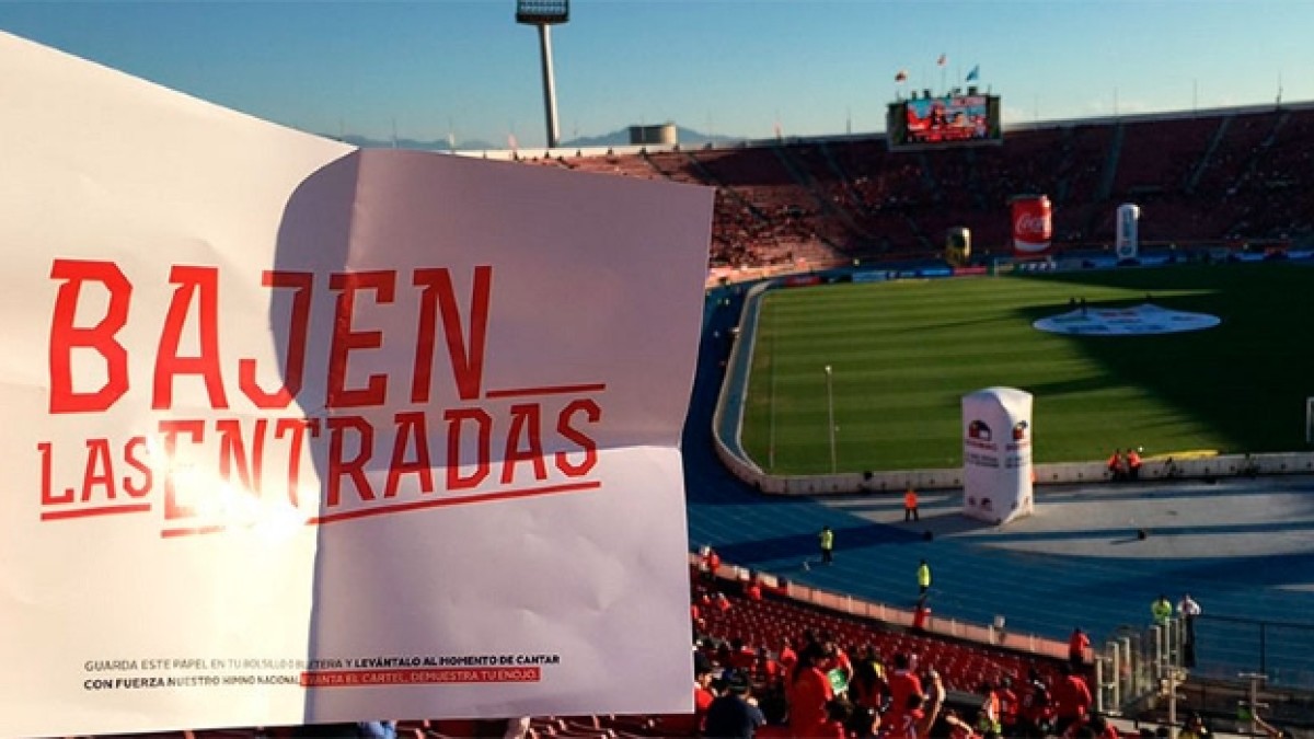 “BAJEN LAS ENTRADAS”. Muchos de los hinchas chilenos en el Estadio Nacional de Santiago ingresaron al partido ante Colombia con carteles con esa inscripción, y al momento del himno nacional chileno los desplegaron causando un verdadero revuelo.