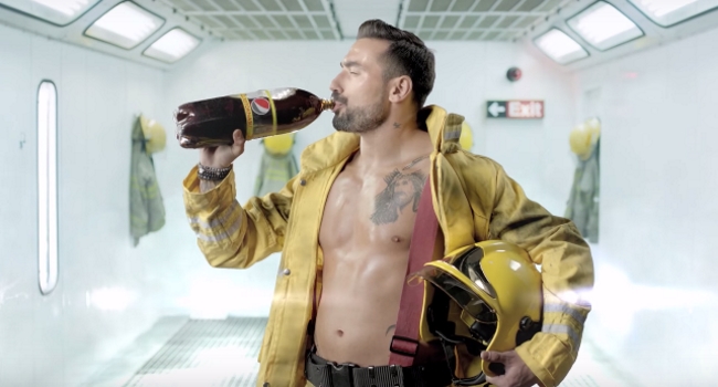 Vestido de bombero, pero sin remera, Lavezzi promociona la nueva botella retornable de Pepsi, que se inclinó en sus publicidades para Argentina por otro argentino tras la aparición de Mauro Icardi.
