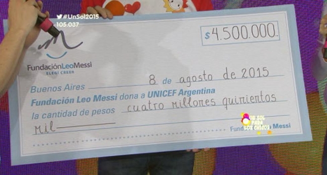 En la edición 2015 de “Un sol para los chicos”, la iniciativa solidaria de UNICEF en Argentina, Lionel Messi tuvo un papel destacado. Es que la Pulga donó 4.5 millones de pesos en una noche que rompió un nuevo record alcanzando los $38.103.579. La donación de hizo a través de Fundación Mesi, su entidad benéfica.