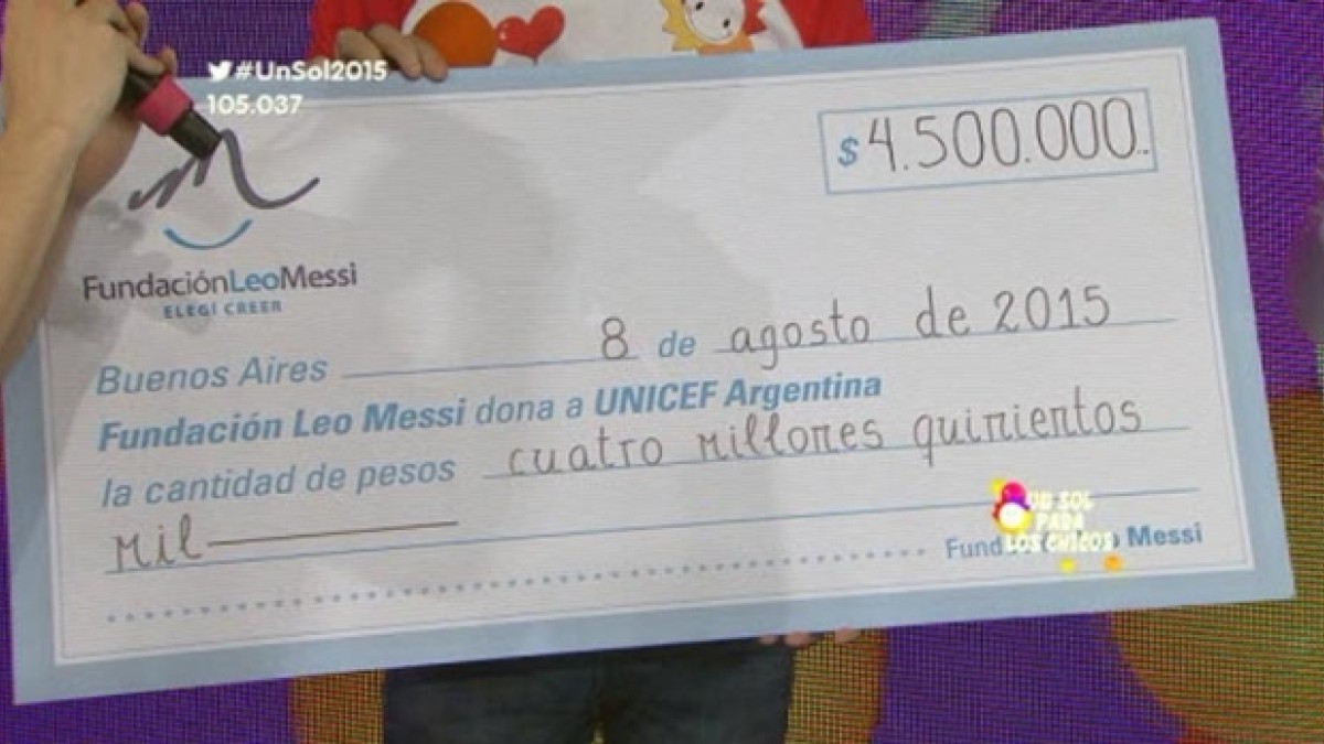 En la edición 2015 de “Un sol para los chicos”, la iniciativa solidaria de UNICEF en Argentina, Lionel Messi tuvo un papel destacado. Es que la Pulga donó 4.5 millones de pesos en una noche que rompió un nuevo record alcanzando los $38.103.579. La donación de hizo a través de Fundación Mesi, su entidad benéfica.