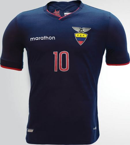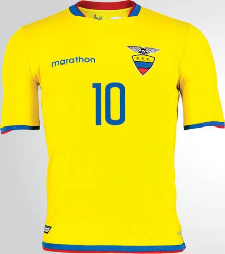 La camiseta oficial es amarilla, con detalles azules y rojos en el cuello, las mangas y la zona inferior. Además, en el interior del cuello aparece la frase “La piel que te hace ecuatoriano”. En tanto la prenda alternativa es azul con detalles rojos, y la misma frase interna.