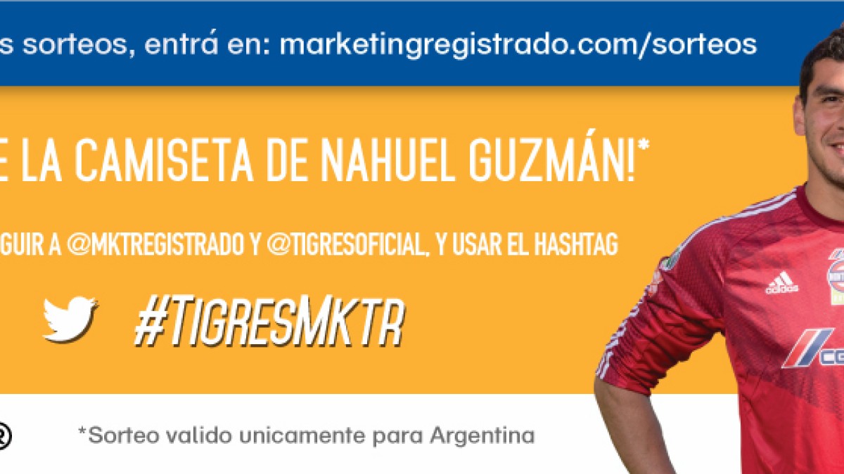 Para ganarte su camiseta tener que seguir a @MktRegistrado y a @TigresOficial en Twitter, y tuitear con #TigresMktR. Este sorteo es válido exclusivamente para Argentina pero muy pronto habrá dos nuevos con la posibilidad de que los fanáticos de todo el continente se ganen más camisetas del equipo.El primero, es por la camiseta oficial de Nahuel Guzmán, el arquero rosarino que es figura en Tigres y que ya es nombre habitual de la Selección Argentina.