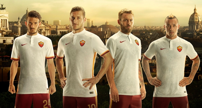 Nike presentó así la nueva camiseta alternativa de la Roma para la temporada 2015/16, donde en el frente predominantemente blanco, aparecen impresos distintos lugares históricos de la arquitectura romana.