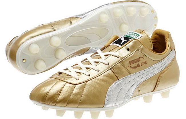Los botines combinan dorado con blanco, con la tradicional lengua de Puma y sus respectivos logos en negro y verde. Mientras la versión original incluía seis tapones de acero, el nuevo modelo tiene trece tapones cónicos.