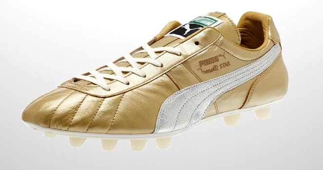 Los botines combinan dorado con blanco, con la tradicional lengua de Puma y sus respectivos logos en negro y verde. Mientras la versión original incluía seis tapones de acero, el nuevo modelo tiene trece tapones cónicos.