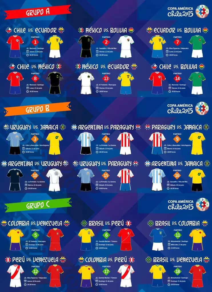 El sitio oficial de la Copa América 2015 difundió una interesante infografía que muestra cómo se vestirá cada uno de los doce seleccionados en sus tres partidos de la primera fase.