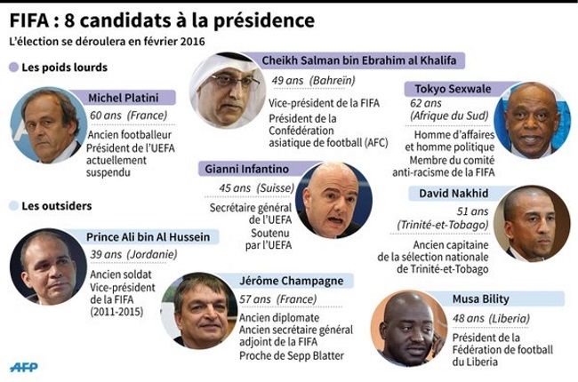 El 26 de febrero de 2016, Joseph Blatter tendrá a su reemplazante como presidente de la FIFA. Ante el cierre de la presentación de candidaturas, son 8 los postulados para tomar el trono que el suizo dejará vacante.