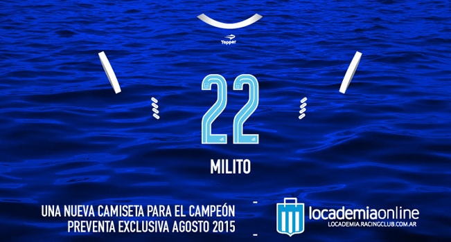 Para el campeón, una nueva camiseta de campeón. La Academia dio a conocer hoy la segunda casaca alternativa que acompañará al equipo de Diego Cocca de acá en adelante. El flamante modelo, confeccionado con microfibia “Dry Cool” y con ventilación lateral a partir de la tecnología Air Flex, podrá ser adquirido por los hinchas a través de Locademia Online. Existirá, además, la posibilidad de encargar un diseño personalizado que tendrá el número 22 y que dirá “Milito” en la espalda.