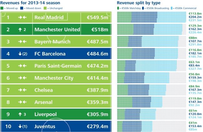 La consultora Deloitte presentó su habitual informe Football Money League, analizando los clubes con mayores ingresos de la última temporada. Dominado completamente por Europa, claramente, el ranking está encabezado por el Real Madrid quien entre días de partido, televisación y patrocinadores recaudó la onerosa suma de 549.5 millones de euros en la temporada 2013/14.