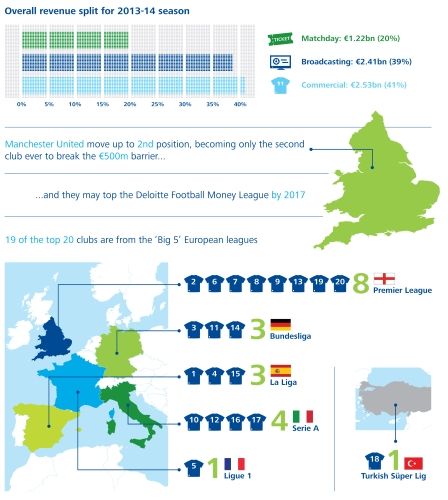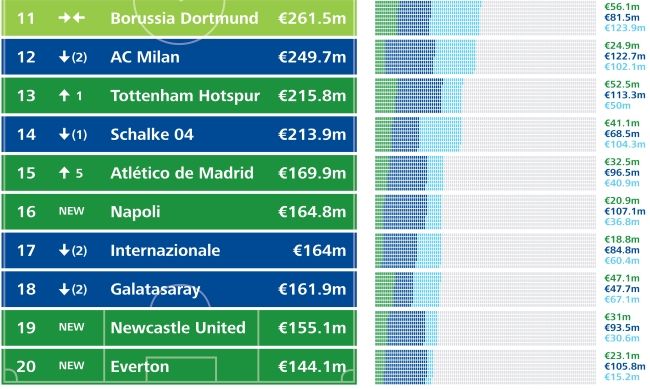Dentro del top 20 hay 8 clubes ingleses, 3 alemanes, 3 españoles, 4 italianos, 1 francés y un turco. Un detalle saliente es que dentro del top 40 están TODOS los clubes de la Premier League, apoyados por los grandes incrementos en los derechos de televisación.