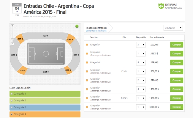 El próximo domingo 4 de julio, Argentina y Chile se verán las caras en la final de la Copa América 2015. Seguramente el estadio Nacional de Santiago esté colmado de hinchas de la Roja ansiosos de levantar el primer certamen continental en la historia del país. Sin embargo, la reventa también forma parte del espectáculo y en el portal Viagogo ya hay entradas disponibles.