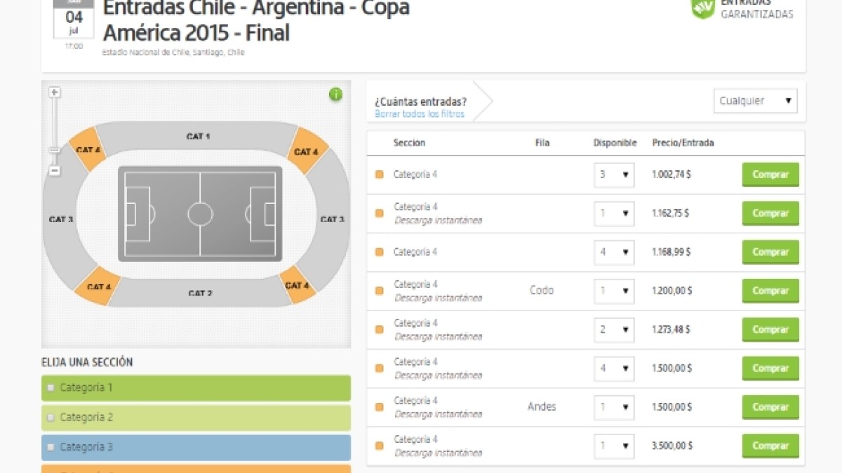 El próximo domingo 4 de julio, Argentina y Chile se verán las caras en la final de la Copa América 2015. Seguramente el estadio Nacional de Santiago esté colmado de hinchas de la Roja ansiosos de levantar el primer certamen continental en la historia del país. Sin embargo, la reventa también forma parte del espectáculo y en el portal Viagogo ya hay entradas disponibles.