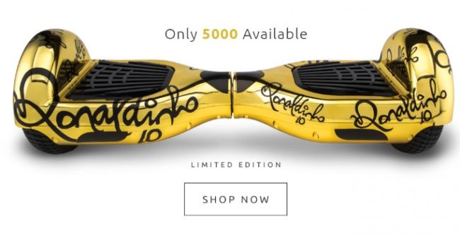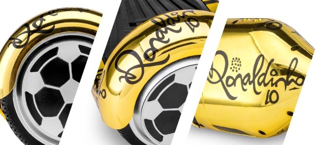 Ronaldinho, alejado de las canchas pero firme empresario, lanzó su línea personalizada de Hooverboards de color dorado y con su nombre grabado, además de su marca R10.