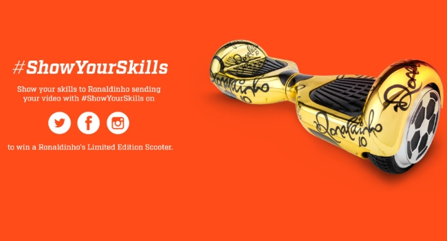 Ronaldinho, alejado de las canchas pero firme empresario, lanzó su línea personalizada de Hooverboards de color dorado y con su nombre grabado, además de su marca R10.