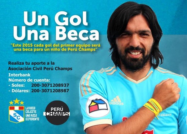 La ONG Perú Champs y Sporting Cristal, último campeón de Perú, lanzaron una campaña orientada exclusivamente a niños carenciados. La misma se llama “Un gol, una beca” y por cada gol que anote el club Celeste se ofrecerá una beca de estudios.
