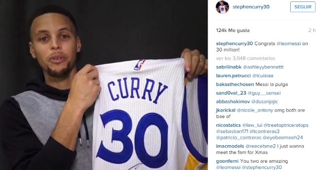 Curry, confeso admirador del argentino, le dijo: "No puedo creer que tengas 30 millones de seguidores en Instagram, Leo. Es increíble. Tenemos que traerte para un partido de los Golden State algún día para celebrar pero mientras tanto te regalo mi camiseta con el numero 30 por tus seguidores".