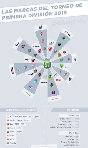 Topper con tres equipos (Vélez, Racing y Newell’s) al igual que Nike (San Lorenzo, Boca y Central), Lotto (Belgrano, Godoy Cruz y Quilmes), TBS (Unión, Arsenal y Huracán), Joma (Sarmiento, Nueva Chicago y Argentinos) y Kappa (Tigre, Aldosivi y Olimpo) son las marcas con mayor presencia.