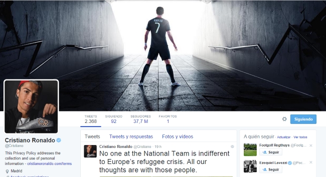 CR7 tiene 37 millones de seguidores en Twitter y es considerado el deportista con mejor presencia en las redes sociales, incluyendo Twitter, Facebook, Instagram, Google+ y YouTube.